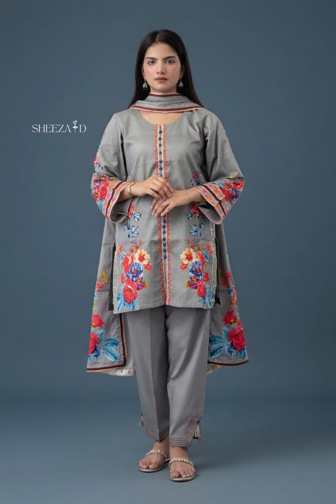Grey Floral 3-Piece Lawn Suit | SD-PR-01