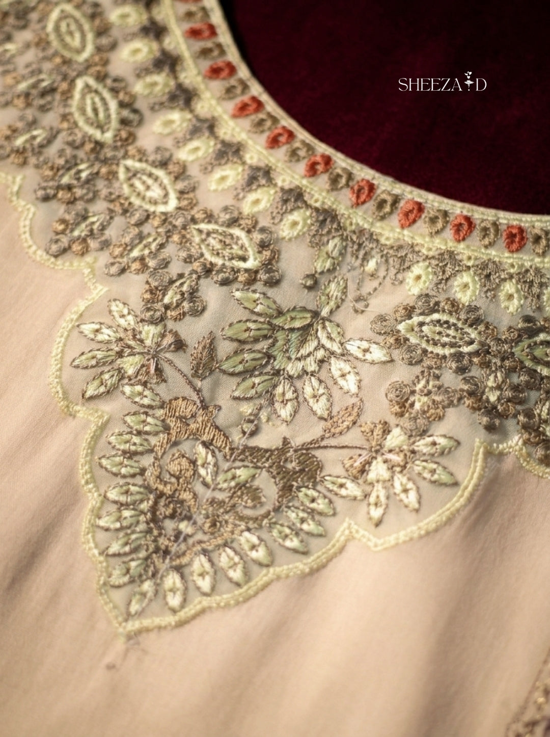 Round embroidered neckline adding a touch of premium craftsmanship.